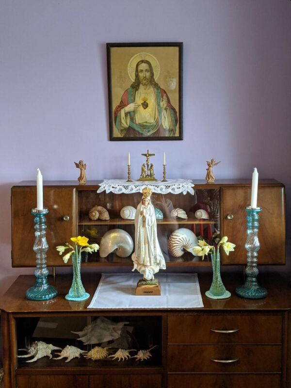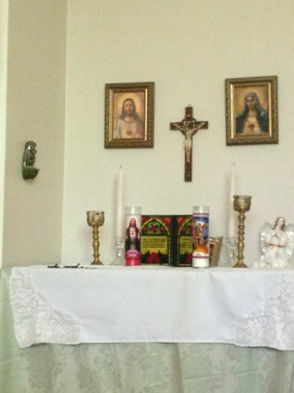 a container of Holy Water, candles, flowers, and her family's rosaries.