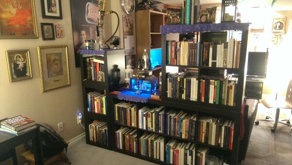 Virgin. Around the altar is my modest but expanding library of Catholic