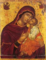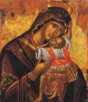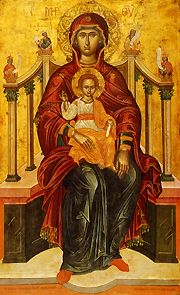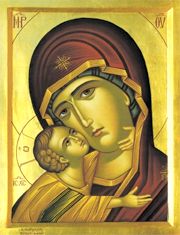 In this icon, Mary, dressed in a red tunic and a dark blue mantle with
