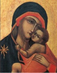 gold trim, holds Jesus in her left arm. Jesus gazes as His mother as He