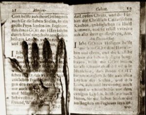 left an imprint on the sleeve of the chemise, stained with blood. The