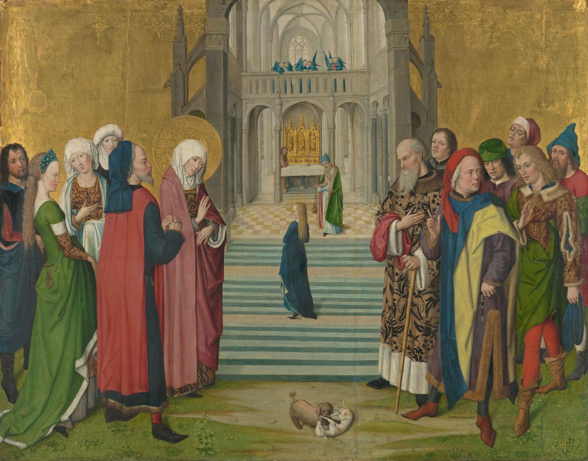 And then when she had accomplished the time of three years, and had left sucking, they brough her to the temple with offerings. And there was about the temple, after the fifteen psalms of degrees, fifteen steps or grees to ascend up to the temple, because the temple was high set. And no body might go to the altar of sacrifices that was without, but by the degrees. And then our Lady was set on the lowest step, and mounted up without any help as she had been of perfect age, and when they had performed their offering, they left their daughter in the temple with the other virgins, and they returned into their place. And the Virgin Mary profited every day in all holiness, and was visited daily of angels, and had every day divine visions.